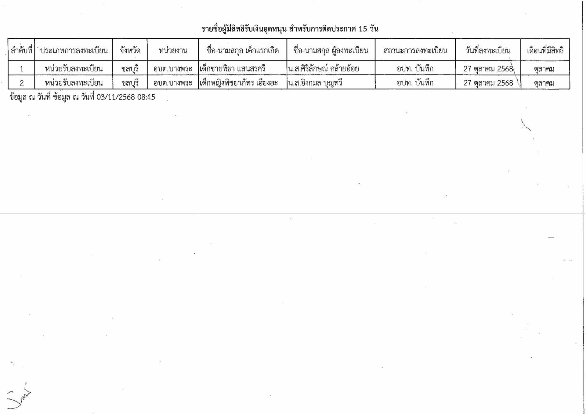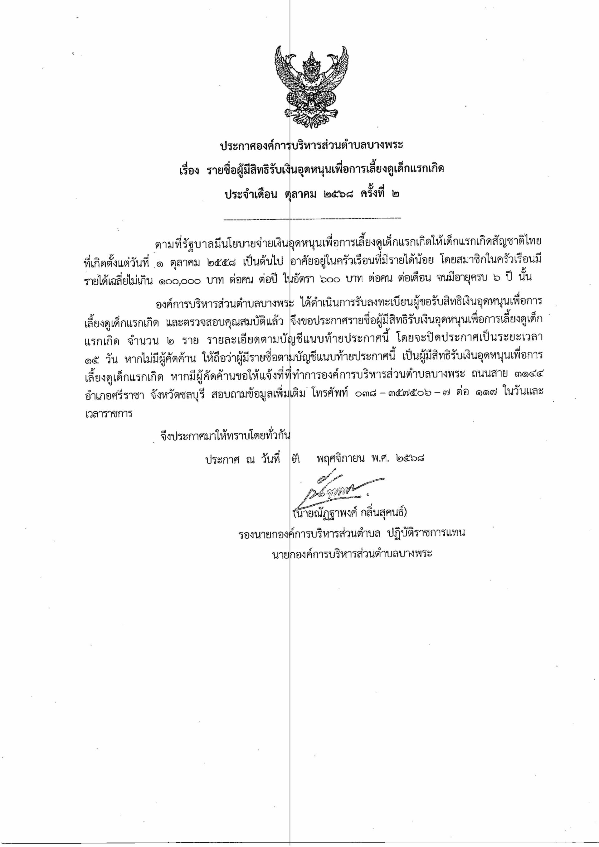 ประกาศองค์การบริหารส่วนตำบลบางพระ เรื่อง ประกาศรายชื่อผู้ขอรับสิทธิเงินอุดหนุนเพื่อการเลี้ยงดูเด็กแรกเกิด ประจำเดือนตุลาคม ครั้งที่ 2
